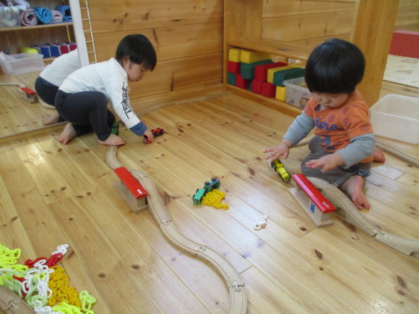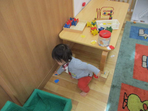 ぴかぴかの名札や新しいカバンに照れつつも、お部屋に入るとおもちゃを物色してすぐに遊び込んでいました。