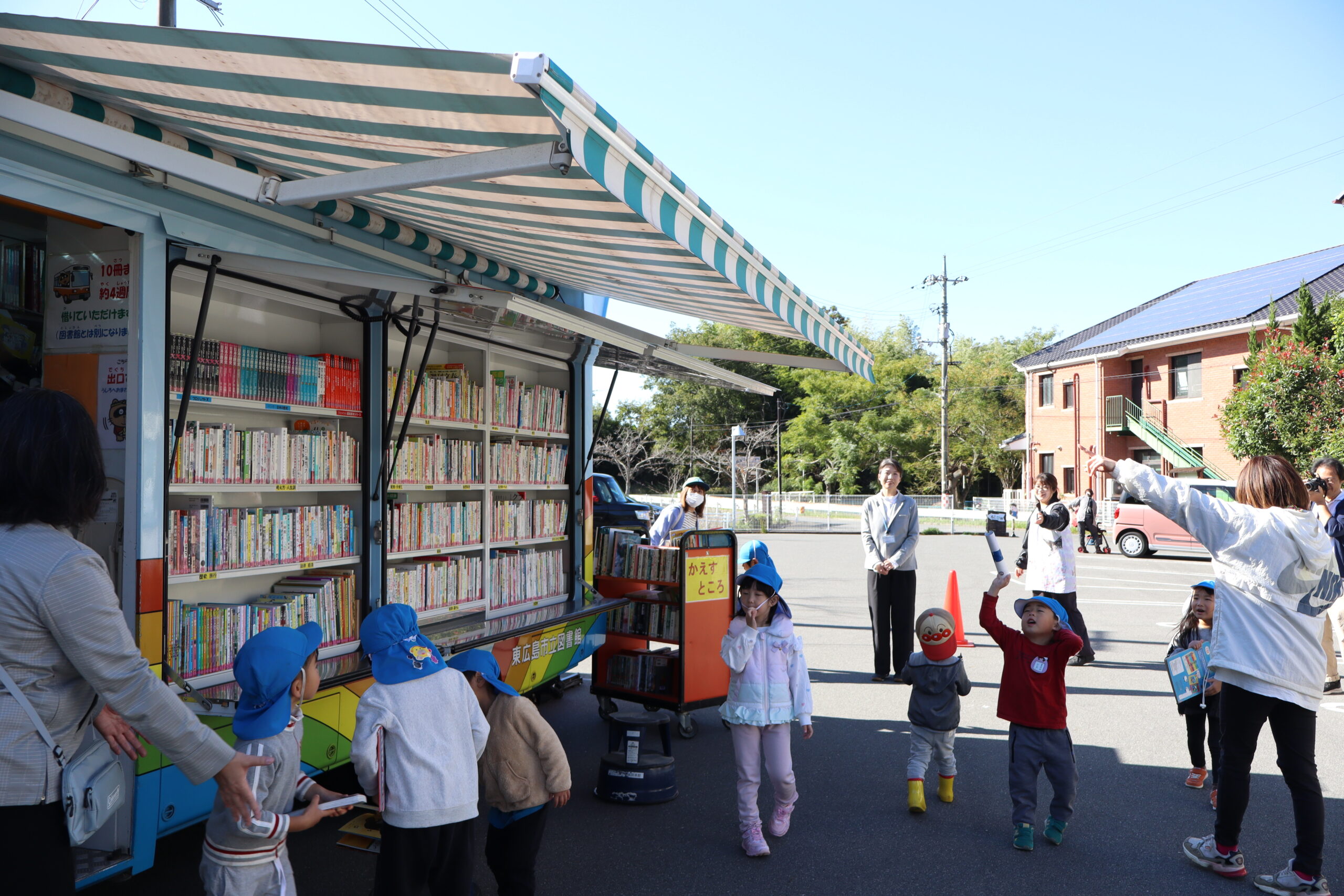 肌寒いけど、いい天気!そんなつかの間の秋の日、園の駐車場に移動図書館の“としょまる”君が来てくれました。