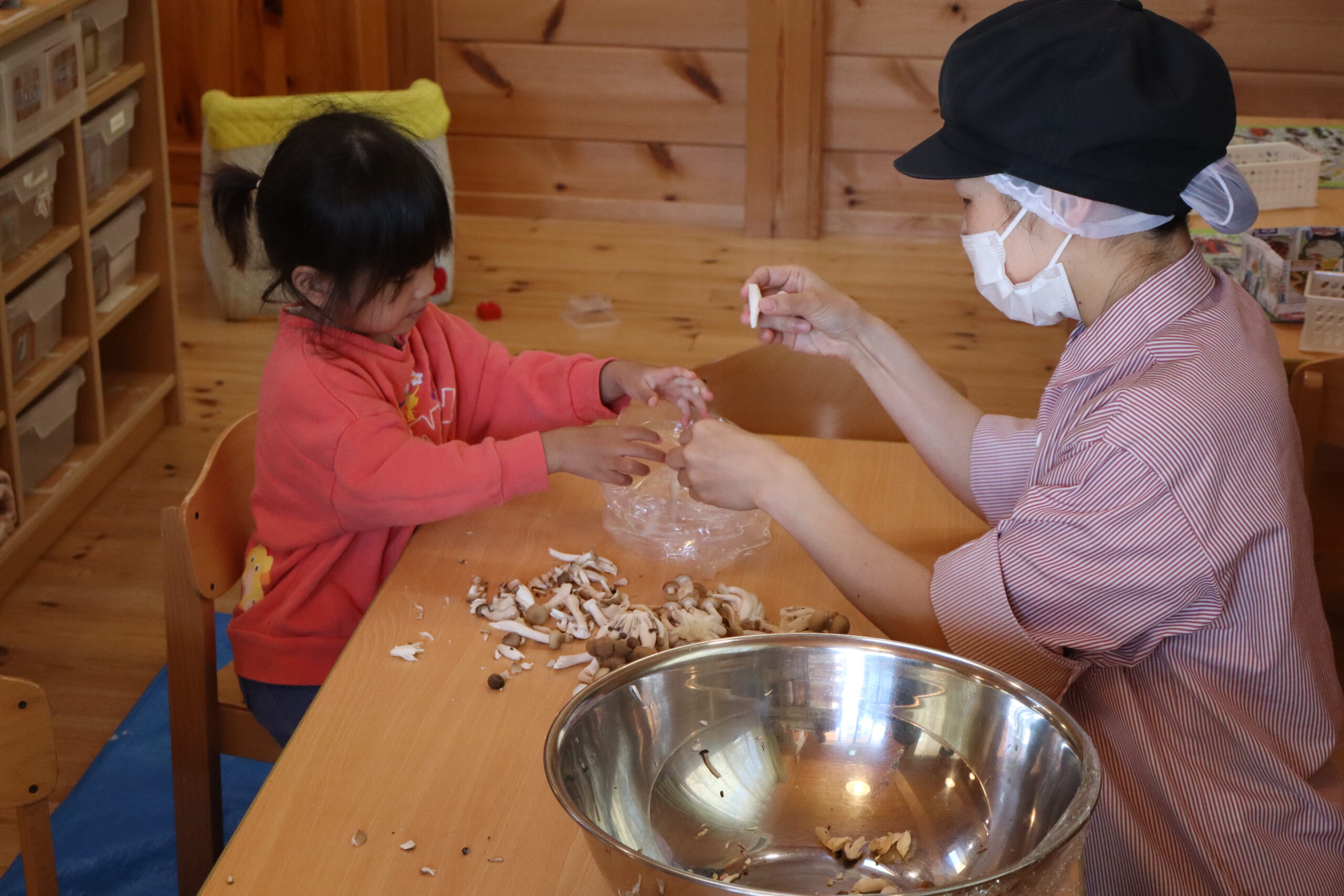 秋といえばきのこ(?)なので、2歳児さんが給食のきのこをちぎる作業をお手伝い。2歳児さんの食育活動は他にもキャベツをちぎったり、上手になってきた指先を使っての作業でお手伝いです。