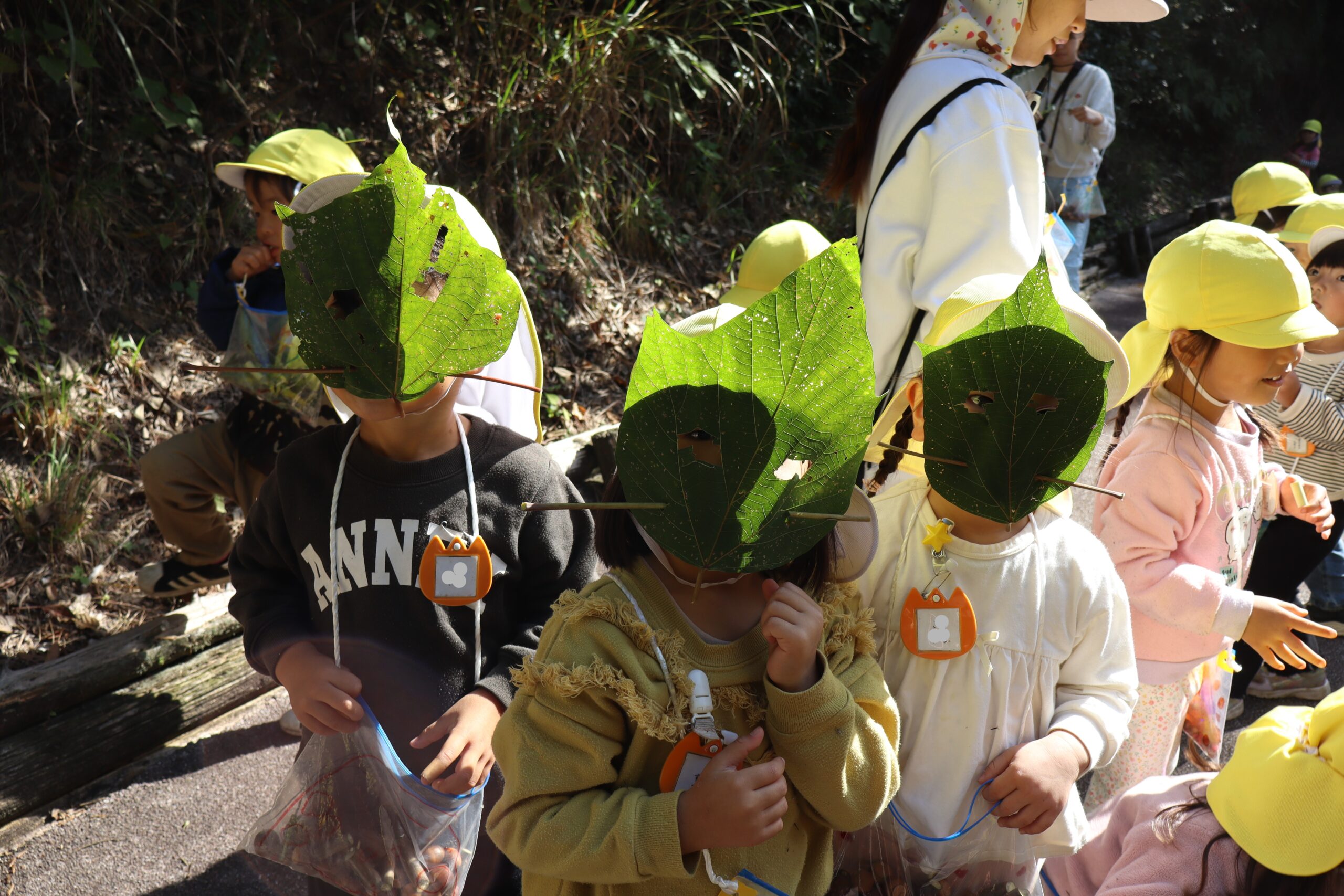 アカメガシワの葉っぱで作ってもらったお面も大人気!