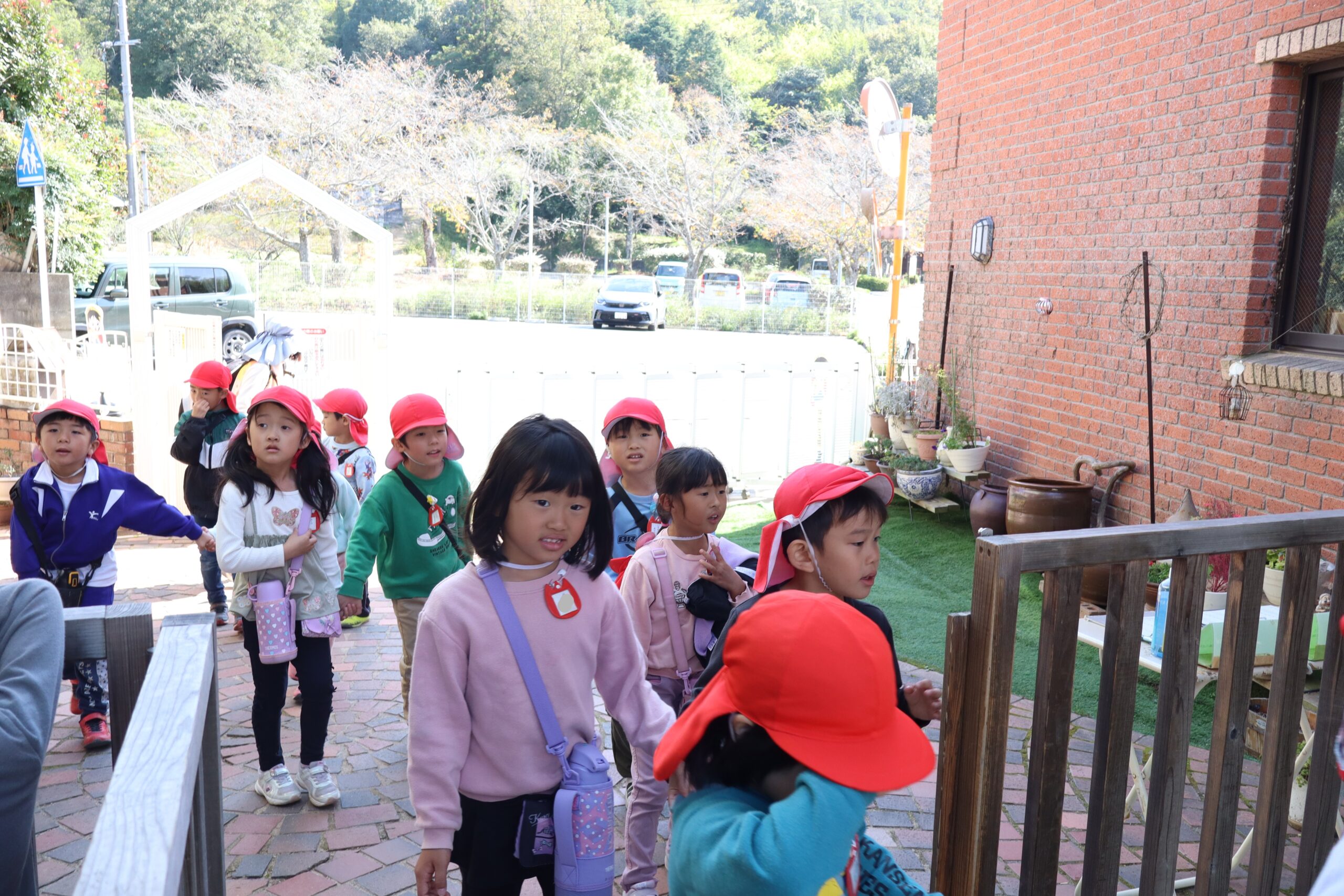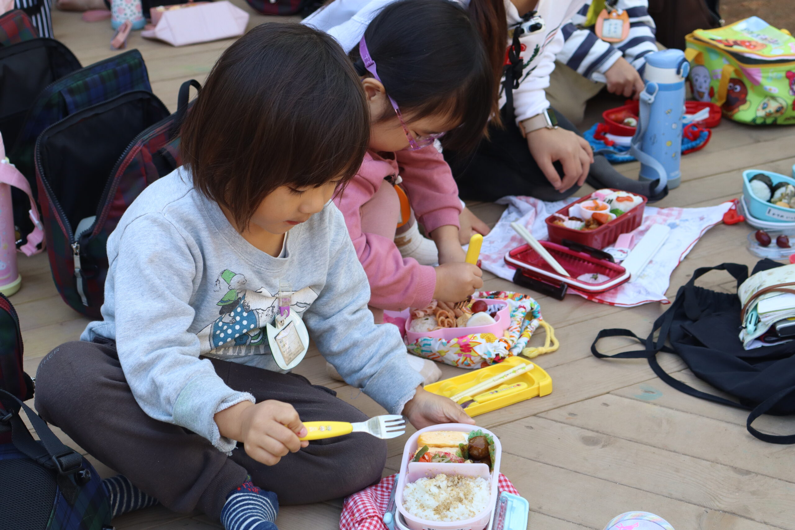 お弁当を広げていたら、近所のN小学校まで散歩に行っていた年長さんたちも帰ってきた。「つかれた!」「おなかすいた!」とクタクタな様子。