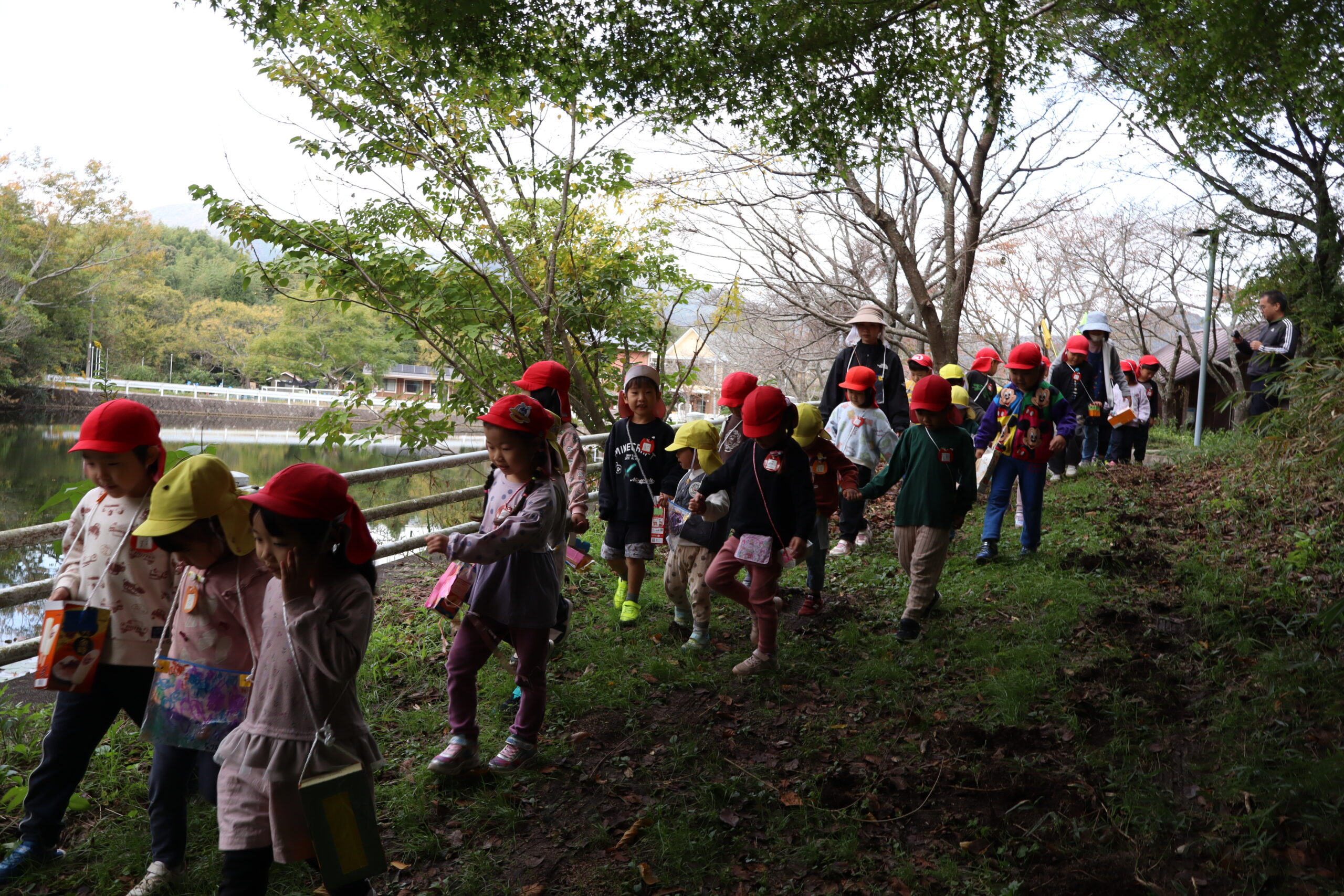 園生活にもすっかり慣れた今の頃合いに、年少さんは遠足へ行きます。昨年度から自然保育推進アドバイザーの先生に同行して頂いている秋の遠足、今年度は菊間馨先生に来て頂きました。き“くま”先生ということで、子どもたちも「くませんせい」と呼んで園の周辺ですが自然遊びへ出かけました。