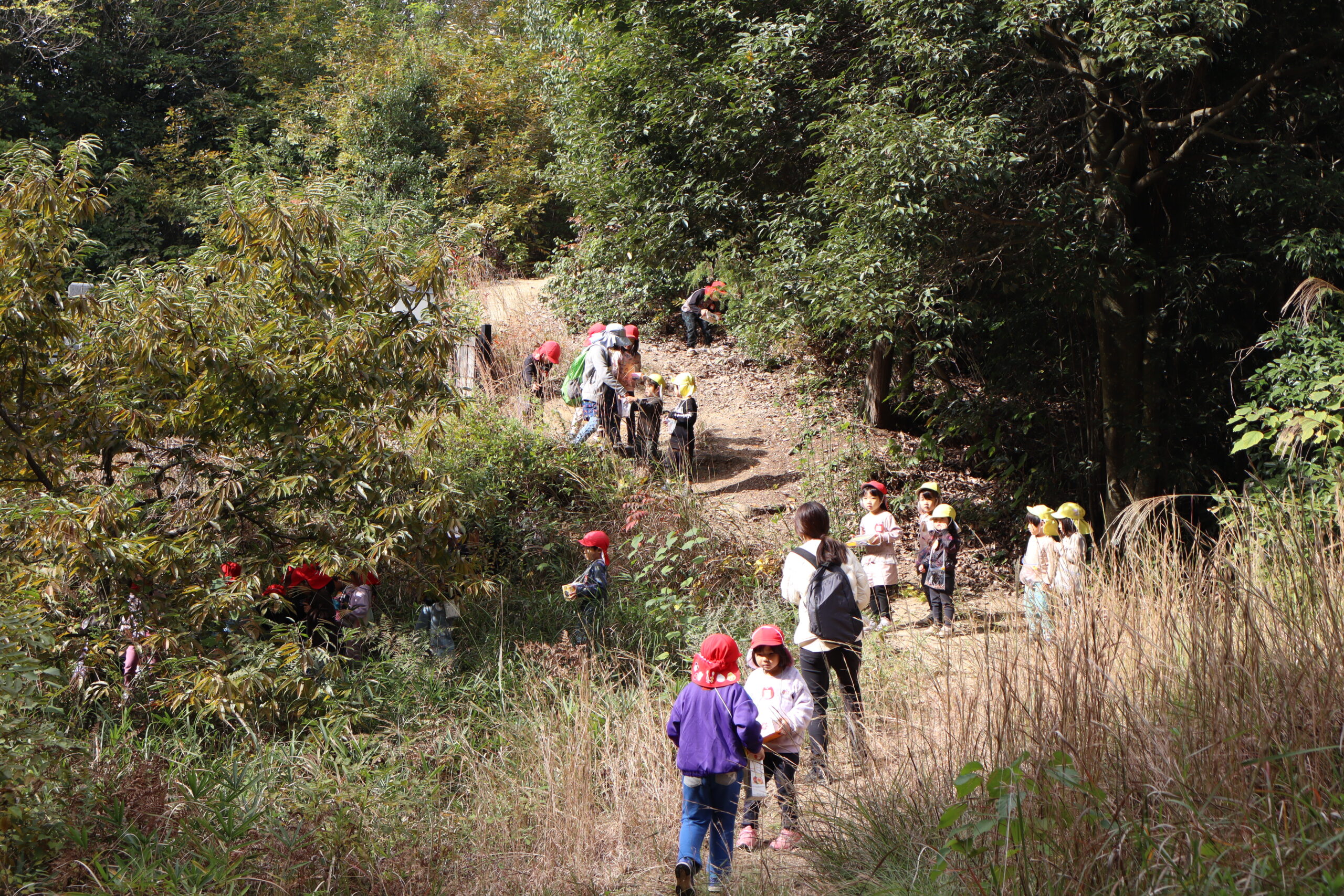 年長さんと年少さんの2学年でどんぐり拾いに行くというので、私もついて行きました。