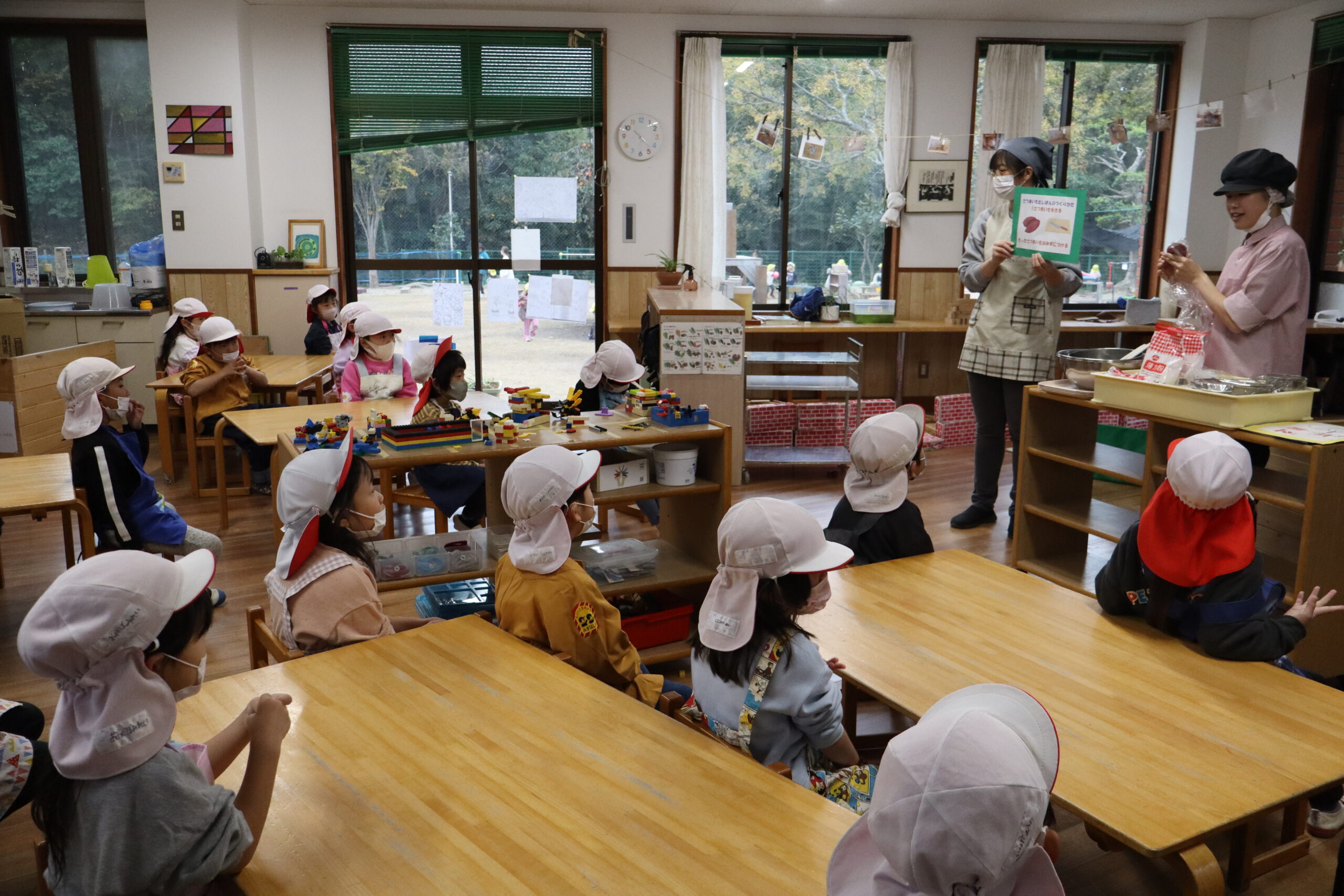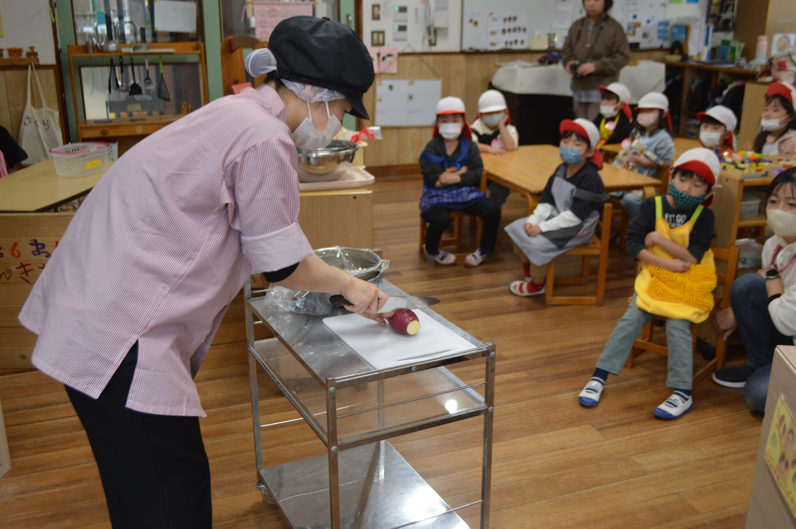・・・とはちょっと違って、年少さんクラスで最近盛り上がっている『焼き芋の移動販売屋さんごっこ』を、もっと盛り上げようという日でした。