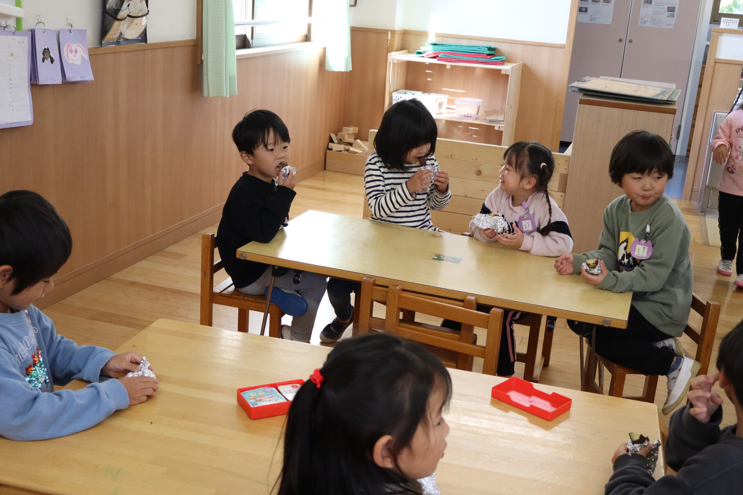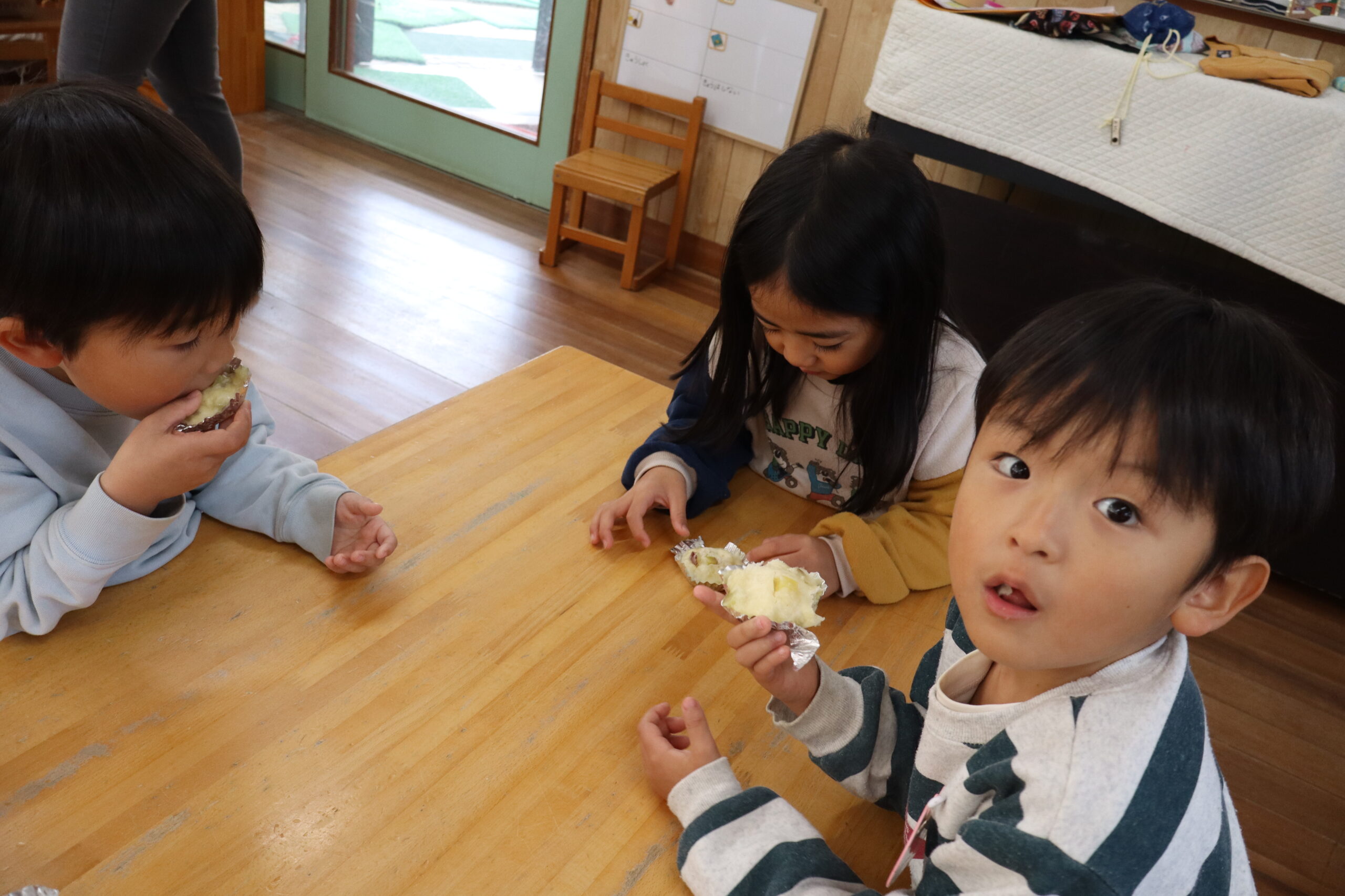 焚火の香りがついたふかしイモですが、ご相伴に預かった年中さんたちは「やきいも、おいしい!」と喜んで食べてくれました。