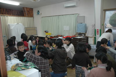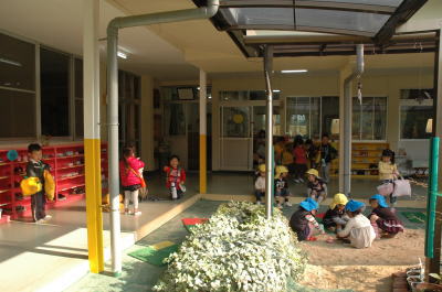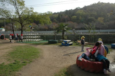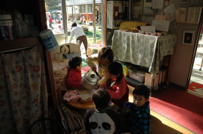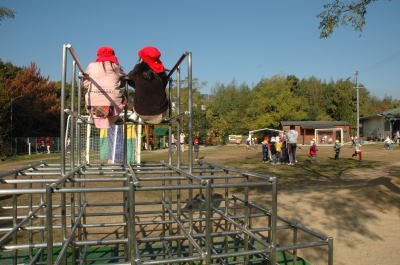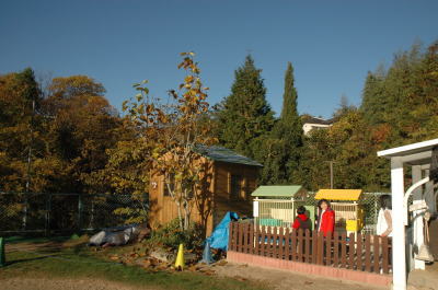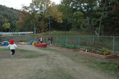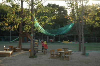 | きょうは職員会で、先生方は今度のげきの会の大道具や背景を作りに出ています。今度の月、水がリハーサルなので、それまでに仕上げておくようにします。写真は、ヤマハのレツスンに来ている子のお兄ちゃん二人が、滑り台の下でゲームをしながら待っているところです。温かいの天気なので、待ちやすいようです。11/20 |