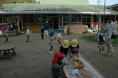 | きょうも曇りなのか黄砂のためなのか、遠くの山が見えない、はっきりしない空模様です。写真は昨日の朝の上園庭です。手前には、落ち葉を使ったあそびをするために机が一台出されています。机の上には、テープ、マジック、紙片などが置いてあります。毎年この時期になると、毎朝、先生たちが出したり片付けたりします。結構大変だと思うのですが、子どもたちが遊びを深めるために、大切な環境設定です。小さな机ですが、先生たちの保育への思い入れを表している、大事な机です。向こうでは青帽子さんたちが縄跳びをしています。上園庭は、朝は日陰になるので、縄跳びで体を温めているのでしょうか。うんどうかいの縄体操をきっかけにしてでしょうか、縄跳びに取り組む子もふえてきました。11/13 |