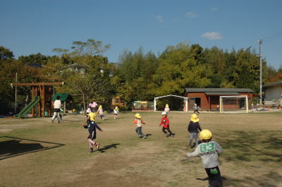 | きょうも17度、快晴。ちょっと雲もあるけど。今日で参観日が無事済みました。一番ホッとしているのは先生かな? 保護者の方も、でしょうね。子どもたちも、かもしれませんね。天候に恵まれた3日間でした。午後、年長さんがクラスの集団あそびでサッカーをしていました。サッカーの試合を見ると、先日(11/3)のサンフレッチェが負けたことを思い出して、くやしさがよみがえります。園児がやっているのに・・・。11/5 |