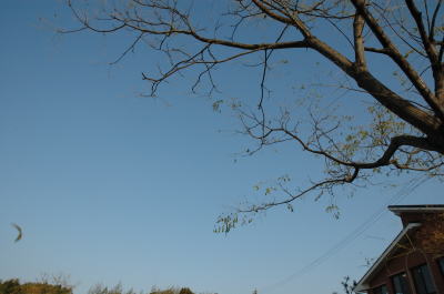 | けさは0度でした。園庭で遊んでいた園児が、割れた氷を持って、見せに来ました。初氷ですね。朝日が葉っぱにあたり始めると、葉っぱが次々と、雨のように、雪のように落ちてきます。その様子を撮ろうと、何枚も写したのですが難しかったです。この写真の左隅の小さいものが、落ちている葉っぱです。風もないのに次々落ちてくる葉っぱの下にいると、大変気持ちがいいものでした。掃除をする先生は大変だけど・・・。11/29 |