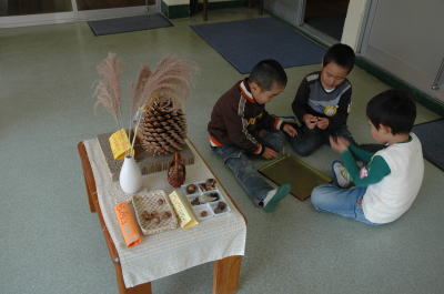 | きょうは、気温15度、快晴。昨日までの寒気も去って、おだやかな秋の日です。写真は昨日の朝、廊下でどんぐりこまを回している年少と年中の子(どんな関係なのかな・・・家も離れているし・・・)を撮ったものです。菓子箱の四角いふたを置いて、そのなかでぶつけ合います。秋ならの遊具ですね。環境机の上にもススキが活けてあったりして、秋らしいですね。11/3 |